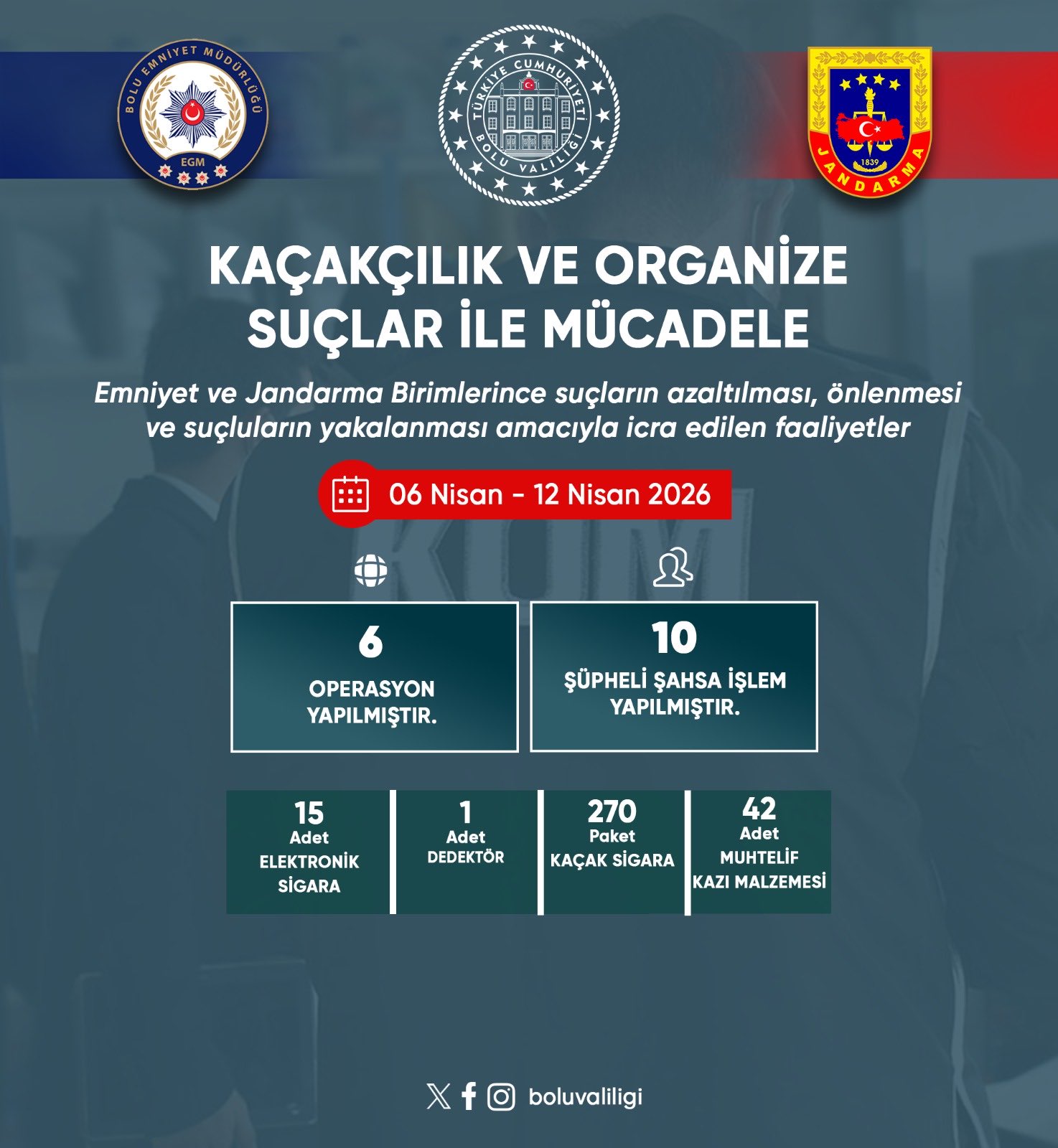 Bolu Valiliği, İl Emniyet Müdürlüğü ve İl Jandarma Komutanlığı tarafından 06 – 12 Nisan 2026 tarihleri arasında il genelinde yürütülen asayiş ve güvenlik faaliyetlerinin raporunu kamuoyuyla paylaştı. Şehrin huzur ve güvenliği ile kamu düzeninin korunması amacıyla gerçekleştirilen operasyonlarda çok sayıda suç unsuru ele geçirilirken, aranan şahıslar adalete teslim edildi.